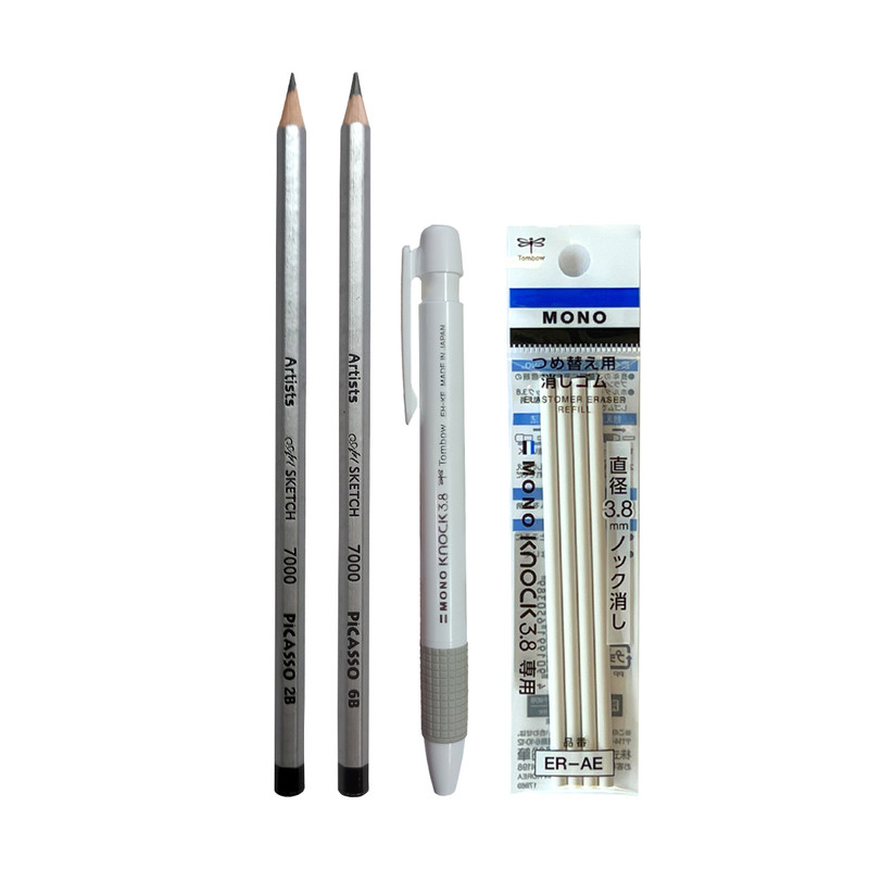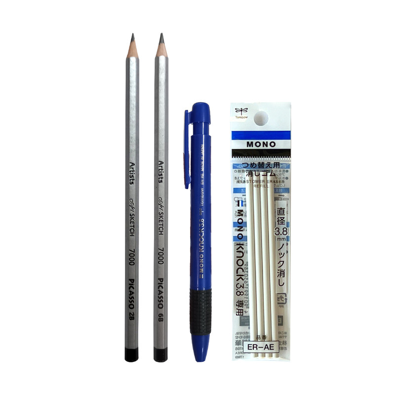 همچنین برای استفاده ی راحت تر هنرمندان عزیز از ابزار طراحی، در این مجموعه دو عدد مداد طراحی با کیفیت، با درجه سختی نوک پر کاربرد B6 و B2 قرار داده شده است.