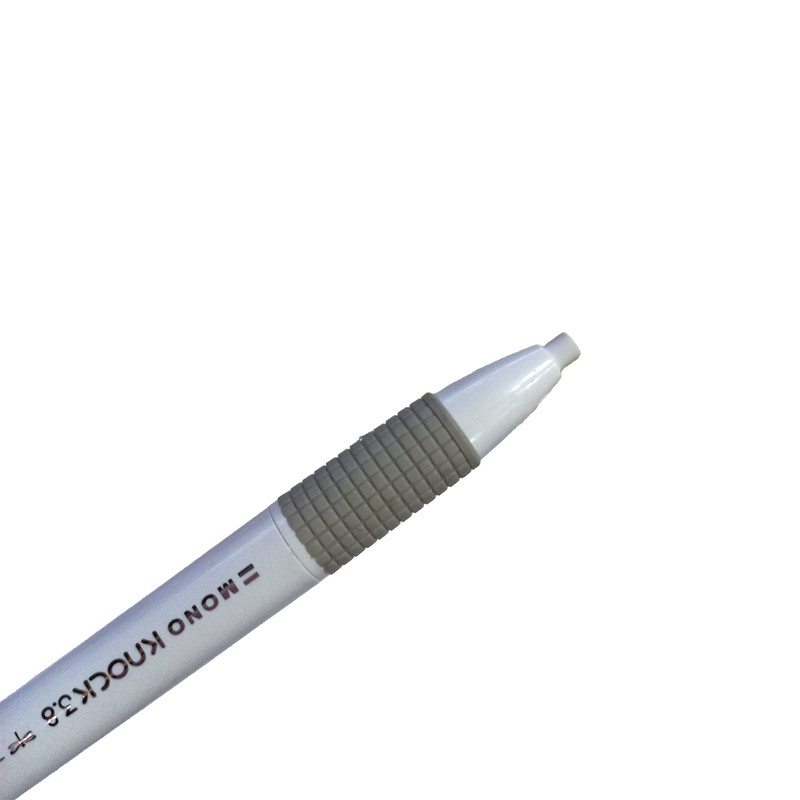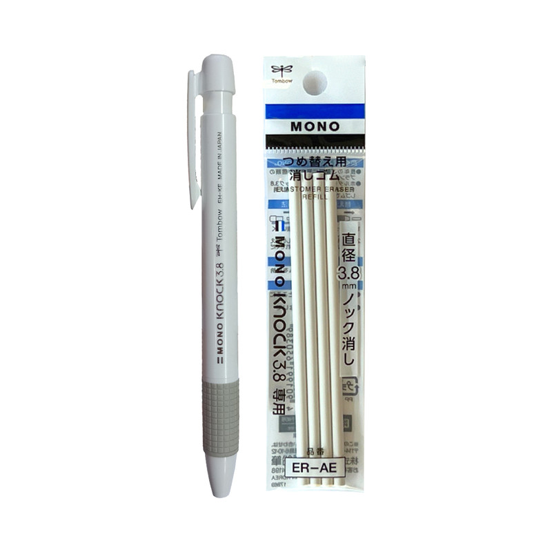 پاک کن اتودی تومبو مدل EH-KE Mono Knock 3.8، محصول از کشور ژاپن و با مغزی گرد 3.8 میلیمتر میباشد که طراحی آن به شکل اتود است و مکانیزمی همانند مداد نوکی دارد و با فشار قسمت انتهایی آن پاک کن بیرون میآید و به راحتی اتود قابل استفاده است.