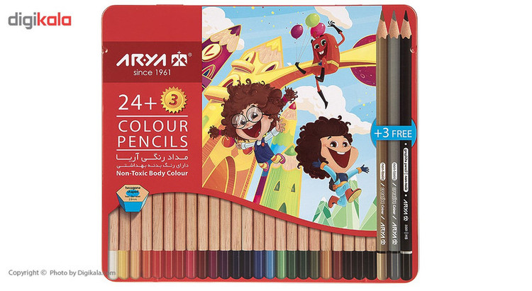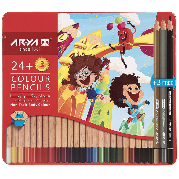 - رنگهای موجود در بستهبندی: 27 رنگ (3 + 24) - دارای سه مداد رایگان با رنگهای نقرهای، مشکی و طلایی - با رنگهای درخشان - دارای نوک محکم و مقاوم در برابر شکستن - با قابلیت تراش آسان - غیرسمی - مناسب برای افراد بالای سه سال