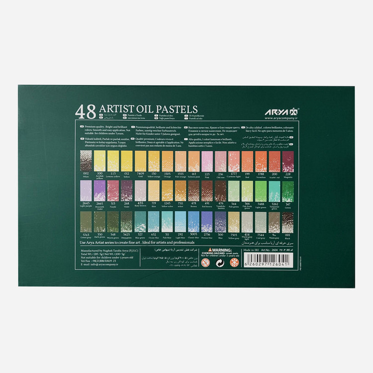 پاستل (مداد شمعی) آریا سری آرتیست سری پاستل های حرفه ای آریا مناسب برای هنرمندان و افراد متخصص کیفیت مطلوب، رنگ های روشن و درخشان ، پوشانندگی بالا و کاربرد روان و آسان. جعبه مقوایی کشویی نامناسب برای کودکان زیر 3 سال وزن خالص: 200گرم